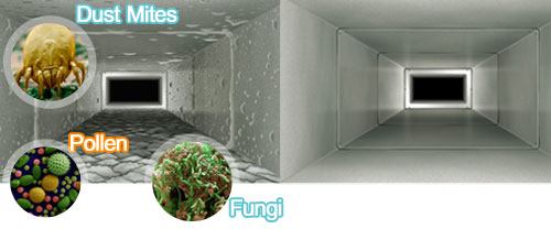 our Duct Cleaning system utilizes a motorized rotary cleaning brush to fit the size of the duct to be cleaned. As the brush rotates either in forward or reverse mode, a powerful scrubbing action with 100% surface contact is achieved with simultaneous blowing action to move the debris toward the receiving vacuum flow. A sanitizing solution is then applied to the newly cleaned Ducting.